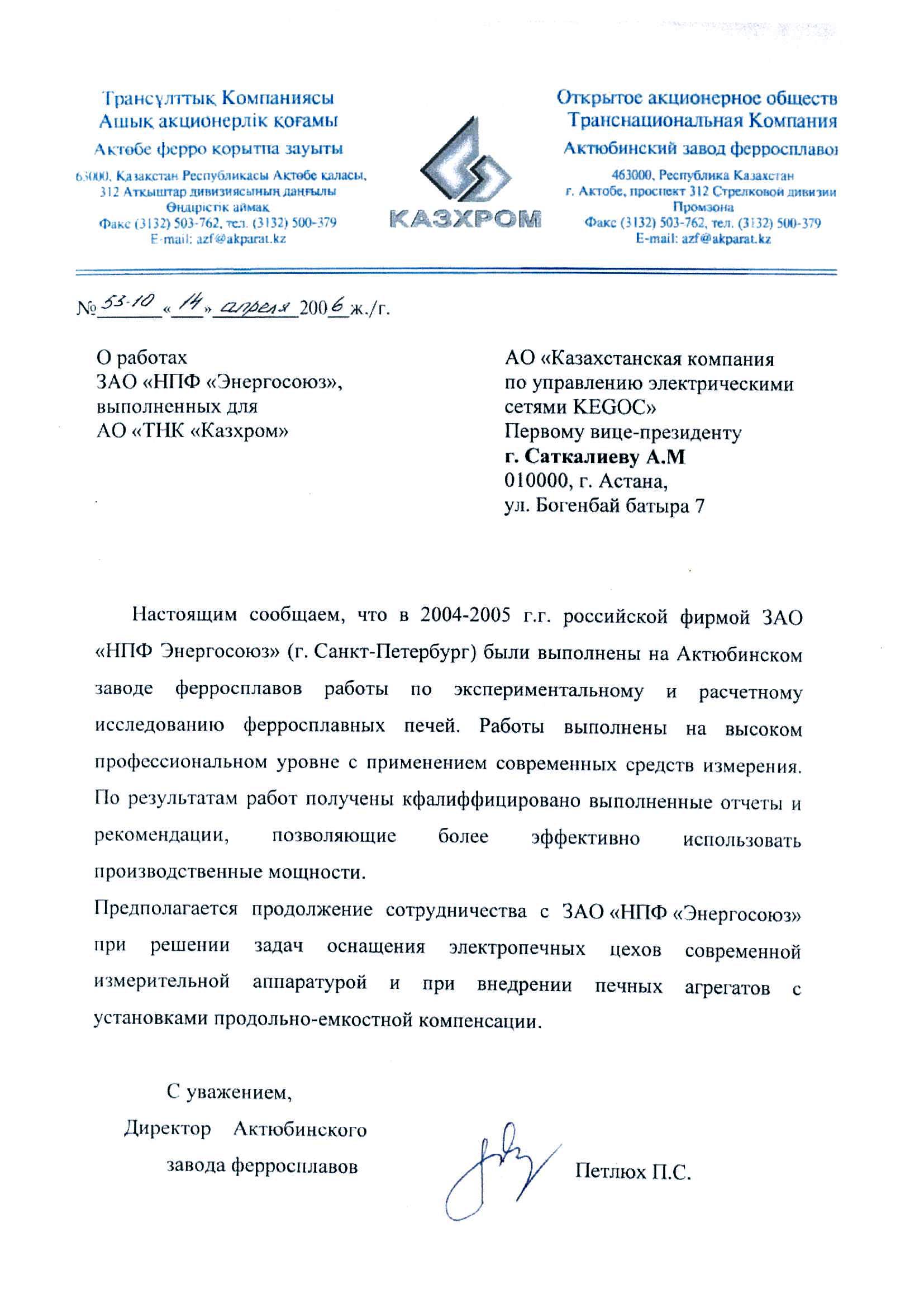От АО «Казахстанская компания по управлению электрическими сетями KEGOK», Казахстан 14.04.06 Скачать в PDF