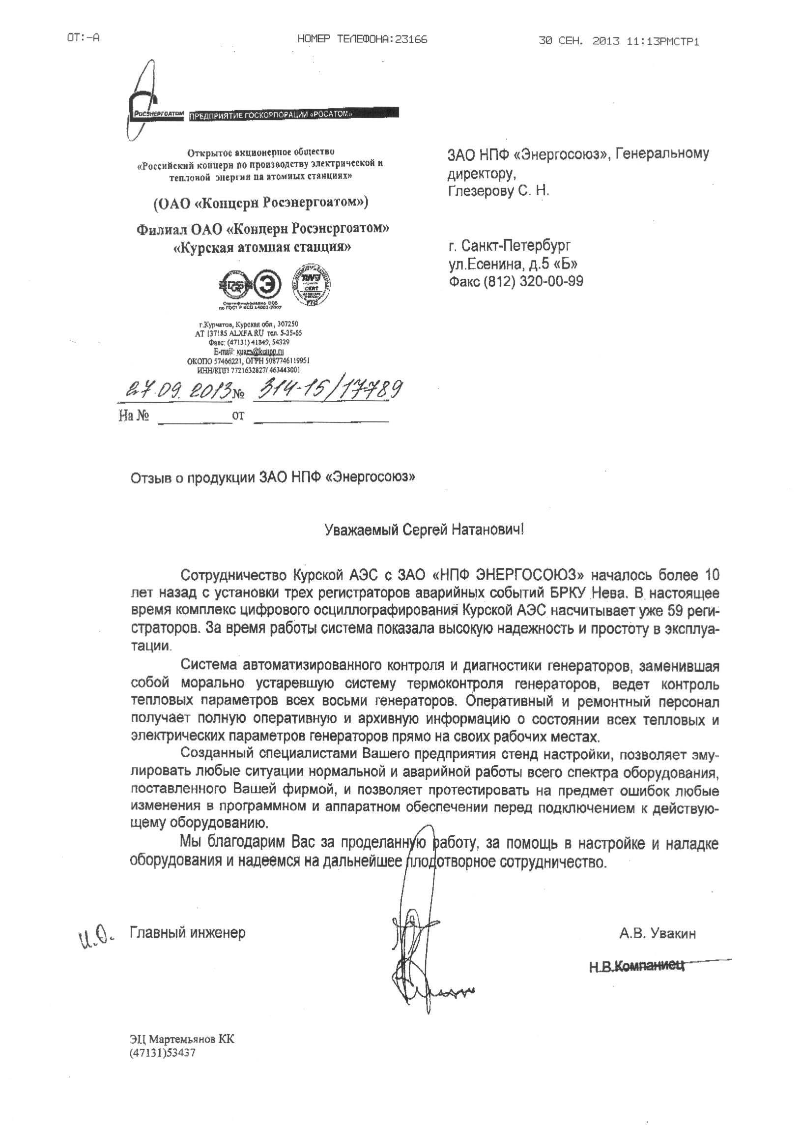 От филиала ОАО «Концерн Росэнергоатом» «Курская атомная станция»