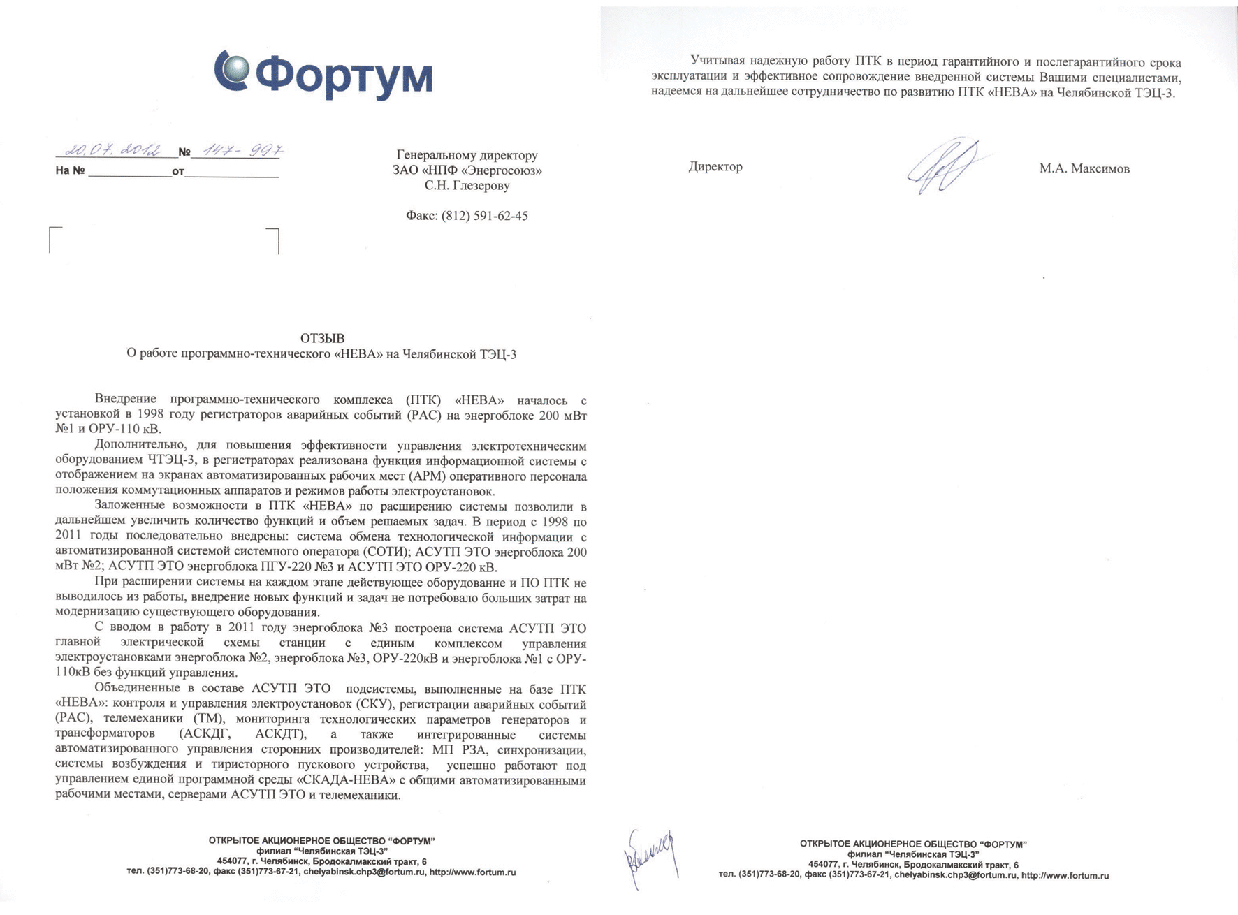 Отзыв о внедрении системы «НЕВА-АСКДГ» на Челябинской ТЭЦ-3 в составе АСУТП ЭТО.