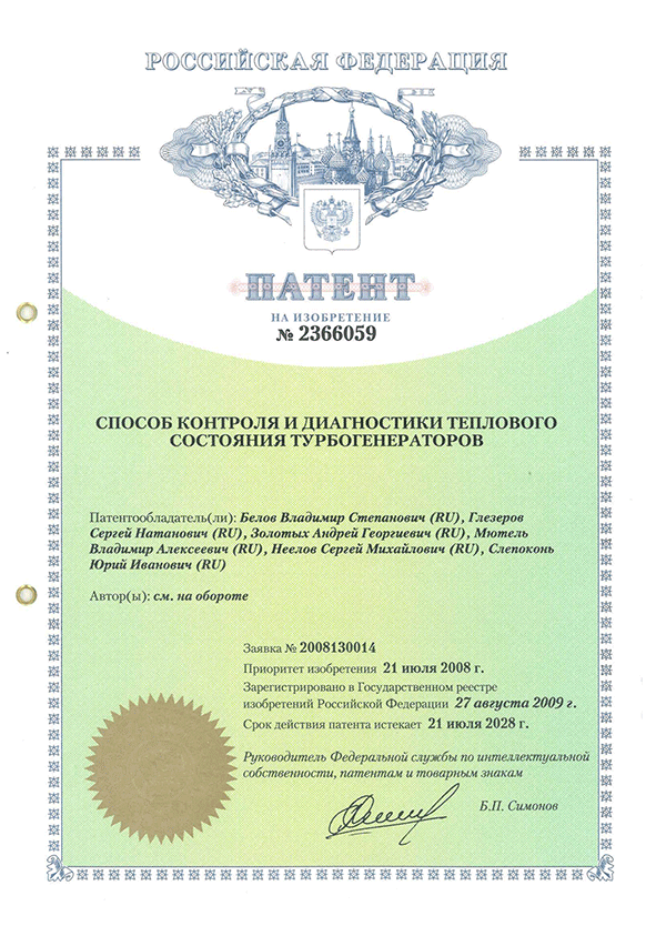 Патент на изобретение №2366059. Способ контроля и диагностики теплового состояния турбогенераторов.